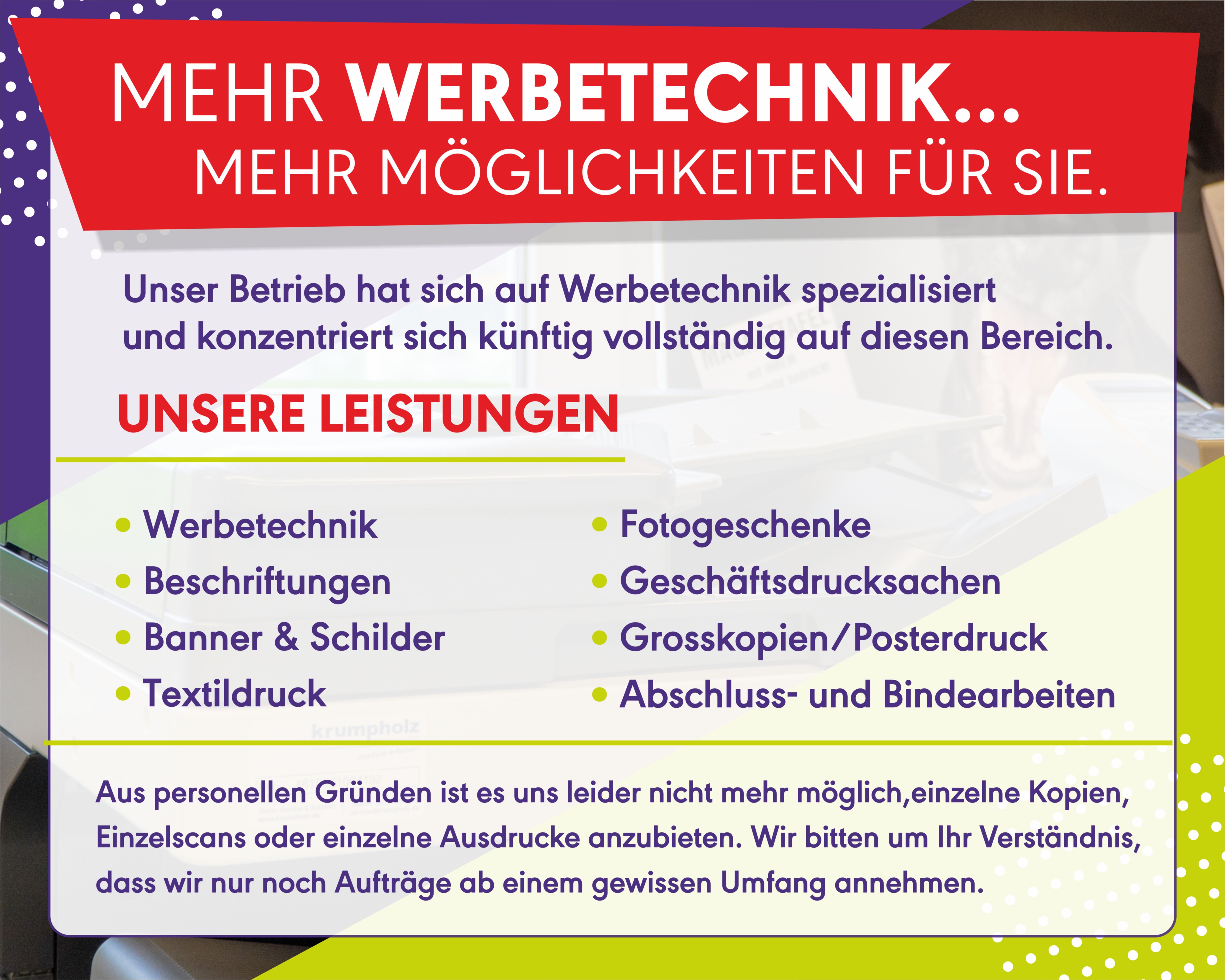 Unser Betrieb hat sich auf Werbetechnik spezialisiert und konzentriert sich künftig vollständig auf diesen Bereich.