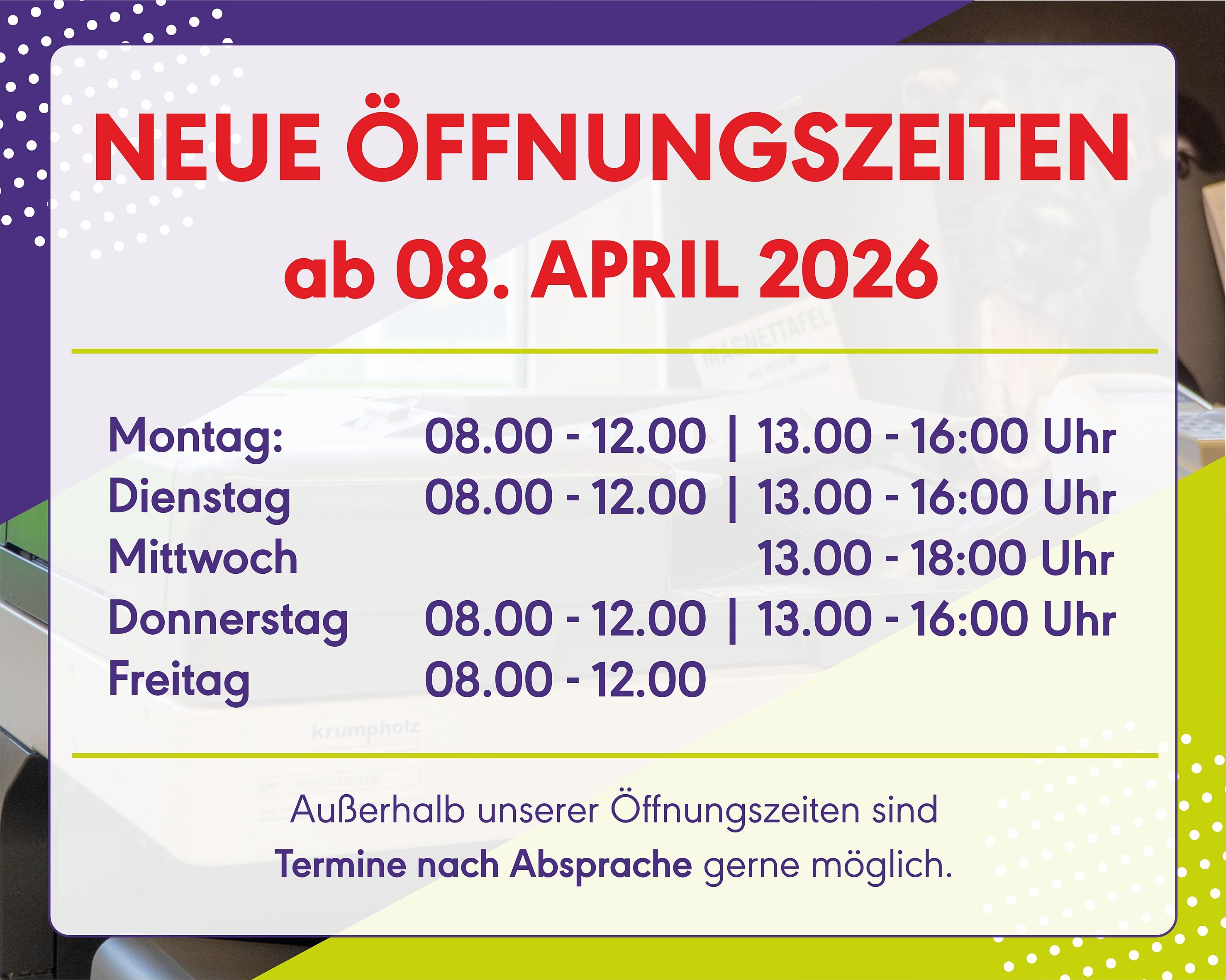 Mo: 08:00 - 12:00 |13:00 - 16:00 Uhr